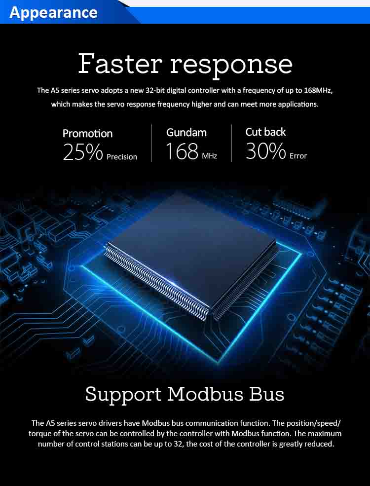 2.Støtter 7 kontrollmoduser: posisjon, hastighet, dreiemoment, posisjon/moment, posisjon/hastighet, hastighet/moment og posisjon/hastighet/moment.